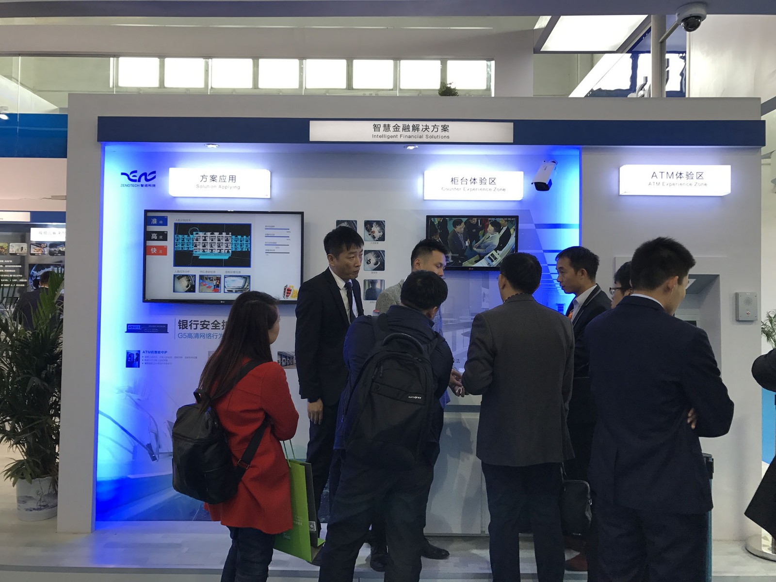 展区主要展出:智慧金融解决方案应用,柜台体验区,ATM体验区,值班操作区。