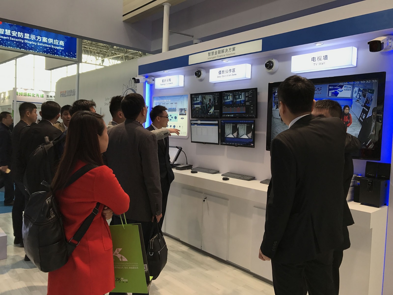 展区展出:中心监控方案,人脸识别方案,岗亭值守方案。